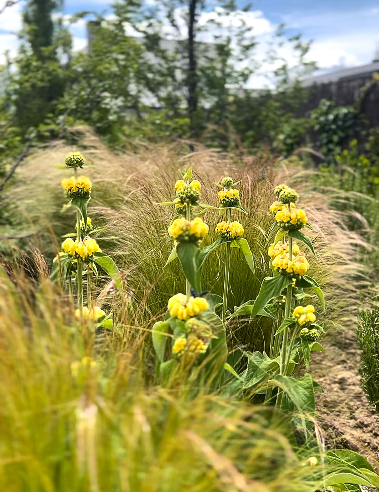 Entre las especies vegetales encontramos romero (Rosmarinus officinalis) y romero rastrero (Rosmarinus officinalis 'Prostratus'), lavandas (Lavandula stoechas) y distintas salvias (Salvia spp.). Entre las plantas ornamentales hemos propuesto diversas vivaces y gramineas como flomis (Phlomis spp.), delphinium (Delphinium spp.), pennisetum (Pennisetum alopecuroides) y estipa (Nassella tenuissima). En áreas cercanas a la fuente, se han plantado además algunos ejemplares de pitosporo (Pittosporum tobira ‘nana’), calamagrostis (Calamagrostis x acutiflora "Karl Foerster") y dietes (Dietes grandiflora).