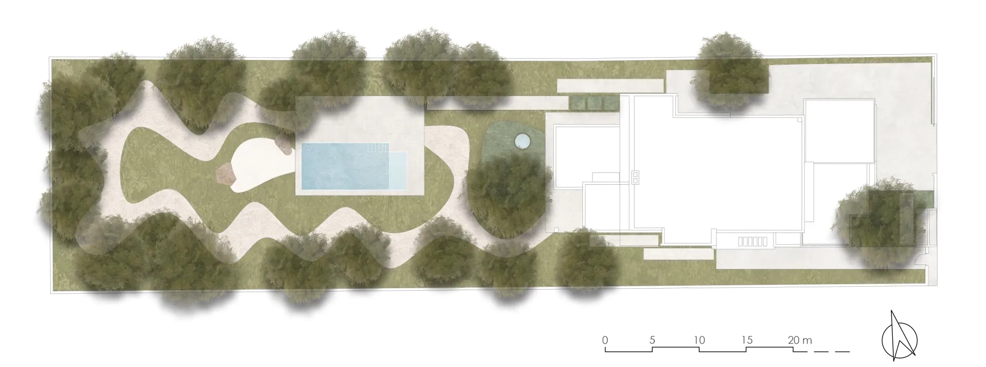 El jardín se ha diseñado como un recorrido. En la zona central, un amplio espacio diáfano y sin barreras, con una pequeña pradera de césped que amplía su visualmente su superficie gracias a al diseño. En el centro, una playa de arena fina de sílice, y en el perímetro de la pradera, un camino de jabre que enmarca la pradera a modo de parterre.